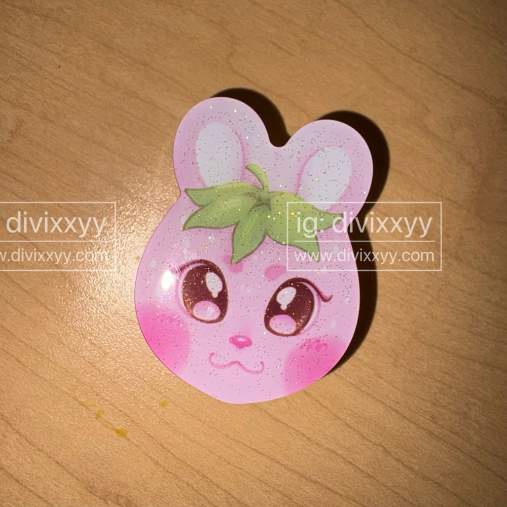 A popping phone grip that looks like a bunny with a strawberry hat!